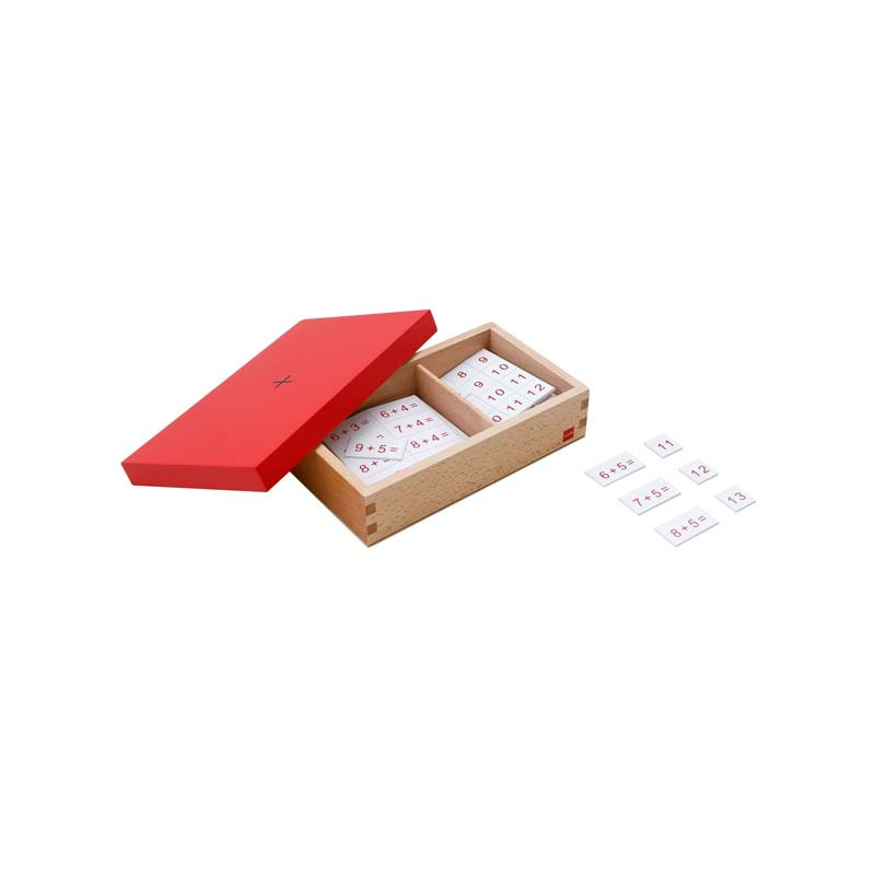 This 2-compartment wooden box with lid contains plastic chips, 1 set with equations printed on them and 1 set with the answers to be used with the Addition Working Charts. All the equations and sums for the addends 1-9 are included.