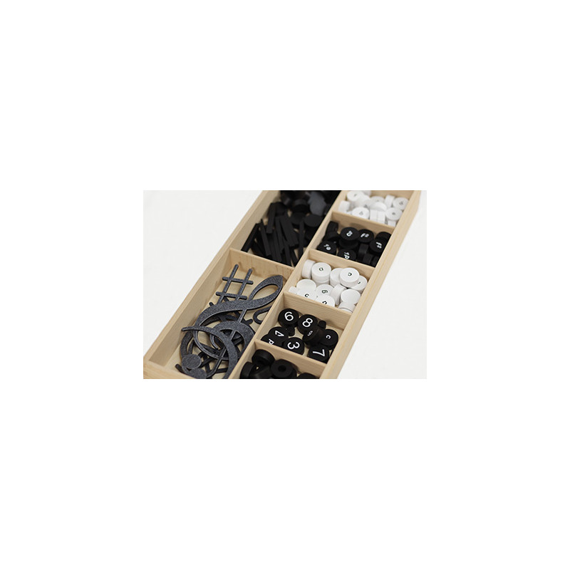 Material used for exercises in notation and composition (A, B, C, D, E, F, G). Supplied in a wooden box with 7 compartments.