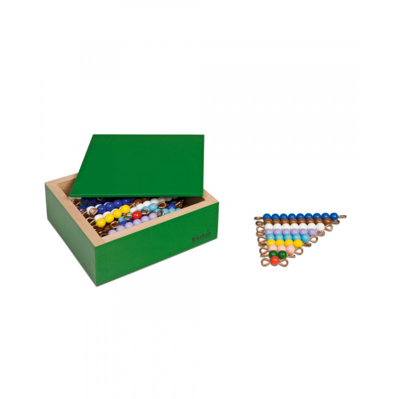 The Colored Bead Stairs are used for activities of addition, subtraction and multiplication. Includes a hardwood box with lid.