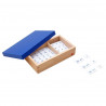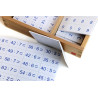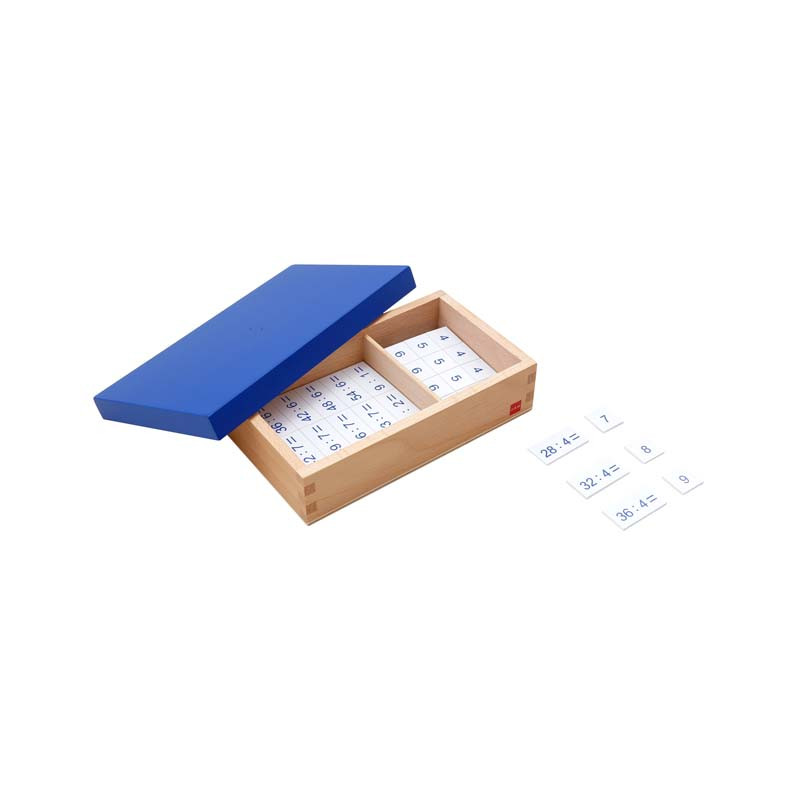 This 2-compartment wooden box with lid contains plastic chips, 1 set of all the equally divisible problems for the numbers 1-81 and 1 set of chips with the answers to be used with the Division Working Charts.