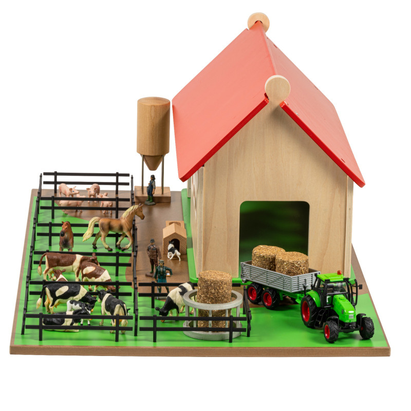 The Farm is used as a language resource in the Montessori classroom. It provides a setting for activities of language enrichment, grammar and reading. Included is: a farmhouse, people, animals, fences and a working base.