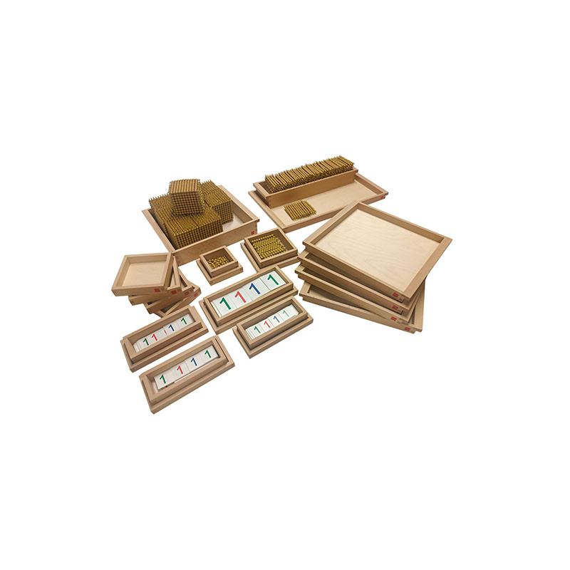 The Golden Bead Material introduces the child to the decimal system with concrete representations of the hierarchy of numbers. Quantity and place value is explored by the child through activities in the operations of addition, subtraction, multiplication and division. The set contains: - 1 wooden box with 100 gold beads - 1 wooden box with 45 gold bead bars of 10 - 1 wooden tray with 45 gold squares of 100 - 1 wooden tray with 9 gold cubes of 1000 - 3 wooden boxes containing one set of small numbers cards from 1 to 3000 - 1 wooden box containing one set of large numbers cards from 1 to 9000 - 4 small wooden trays for units - 4 medium wooden trays - 1 large wooden tray