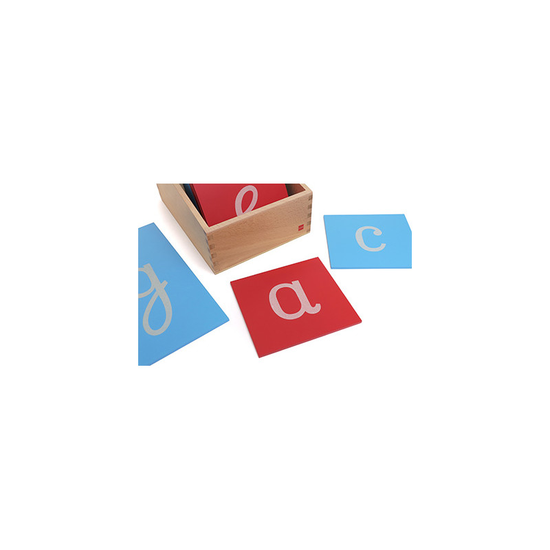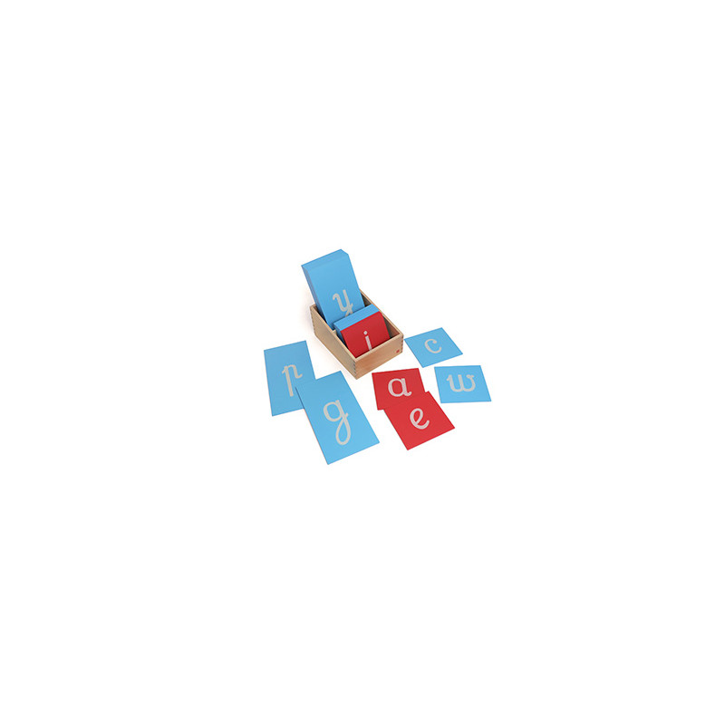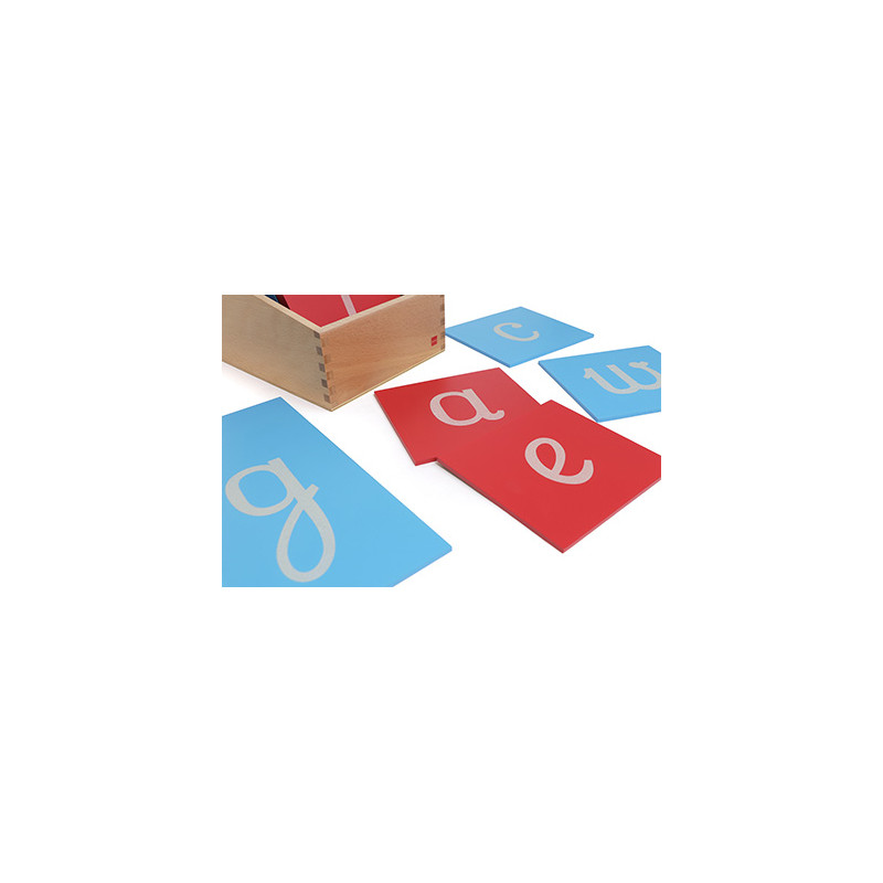 The Sandpaper Letters guide the hand for writing as the child traces the letter shape in the style and direction they are written. The Sandpaper Letters are on wooden boards painted red for the vowels and blue for the consonants. A wooden display box is included in the set.