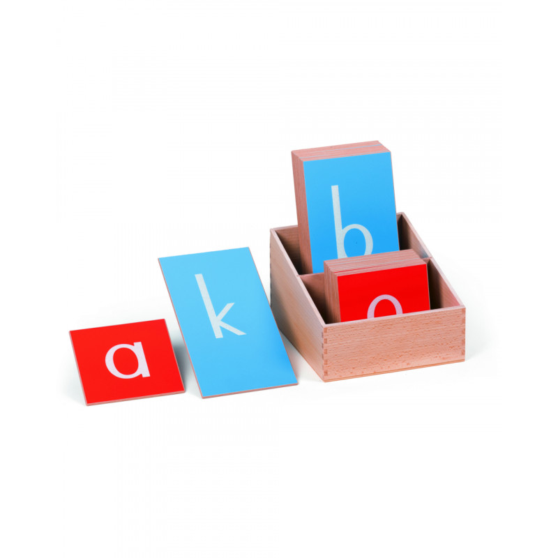 The Sandpaper Letters guide the hand for writing as the child traces the letter shape in the style and direction they are written. The Sandpaper Letters are on wooden boards painted red for the vowels and blue for the consonants. A wooden display box is included in the set.