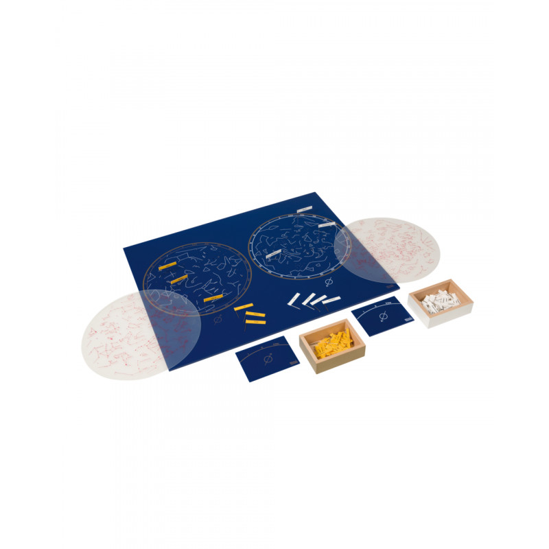 Using The Stars Exercise, children gain an understanding of the universe and become familiar with the star-spangled sky. The Stars Exercise includes the most significant stars and planets. This material is based on the Montessori concept of starting by showing the whole, in this case, the universe. Includes: a map showing the skies of the northern and southern hemispheres, a gold-colored box and a white box with yellow (northern hemisphere) and white (southern hemisphere) flags, a sheet of labels for the flags. On one side is the Latin name, on the other, the name of the constellations, 2 plastic printed circles showing the constellations, used as the control and instructions.