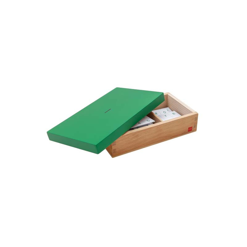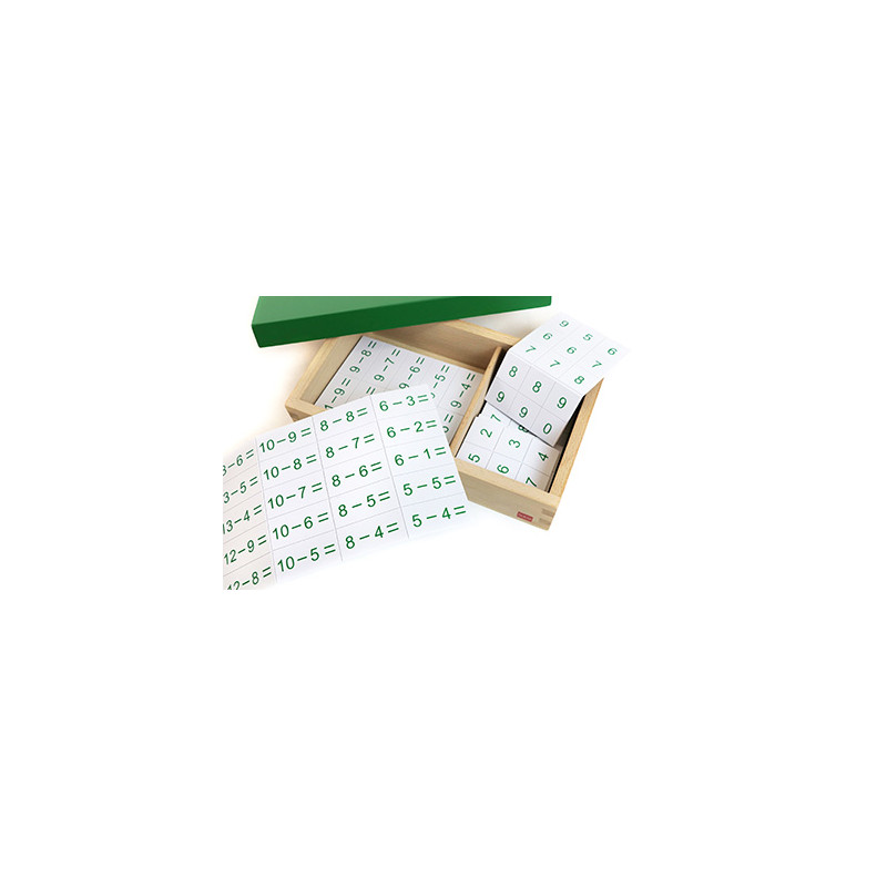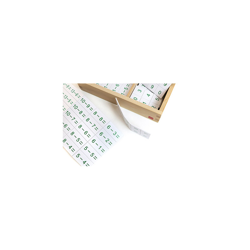 This 2-compartment wooden box with lid contains plastic chips,1 set with equations printed on them and 1 set with the answers to be used with the Subtraction Working Charts. All the equations and differences for the subtraction combinations 1-18 are included.