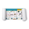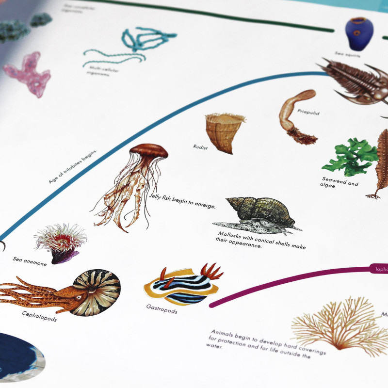 The time line of life represents the beginning of life on earth from the simplest forms through the appearance of human beings. A great variety and magnificence of life is presented, with each organism a contributor to a vast cosmic scheme. It traces the Paleozoic, Mesozoic, and the Cainozoic periods, beginning with the kingdom of Trilobites and ending with the human being. The teacher indicates on a time line where vertebrates began, followed by fish and plants, then amphibians, reptiles, birds, and mammals. This time line is the basis for lessons in chemistry, nutrition, categories of animals and plants, care and requirements of different animals, and their interrelationship with an ecological system. Students are introduced to formal scientific language of zoology, botany, and anthropology. The set includes 2 timelines: Control with text and pictures; Mute with lines and background; Movable Pieces printed on transparent material; Labels. Measures: 46x275 cm
