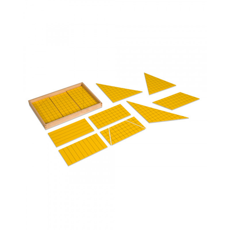 This material is used as an introduction to the study of area. Through exercises with these triangles, the child discovers how the area of a triangle is derived. The material contains 20 yellow, square ruled figures for the exercises of area stored in a beech wood box with lid.