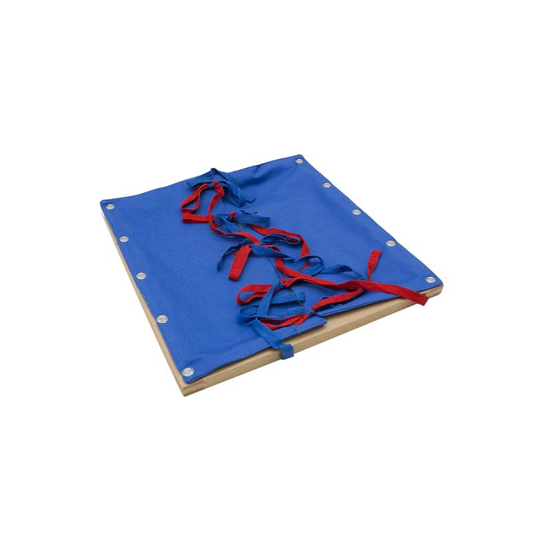 Questo materiale fa parte di una serie di 12 telai con altrettante diverse allacciature. Attraverso l'attività svolta con i telai delle allacciature, il bambino sviluppa il coordinamento, la capacità di concentrazione e di autonomia. Questo telaio è realizzato in legno di faggio con tessuto durevole fissato in modo tale da garantire durabilità e praticità di utilizzo. Dimensioni: 30x30 cm.