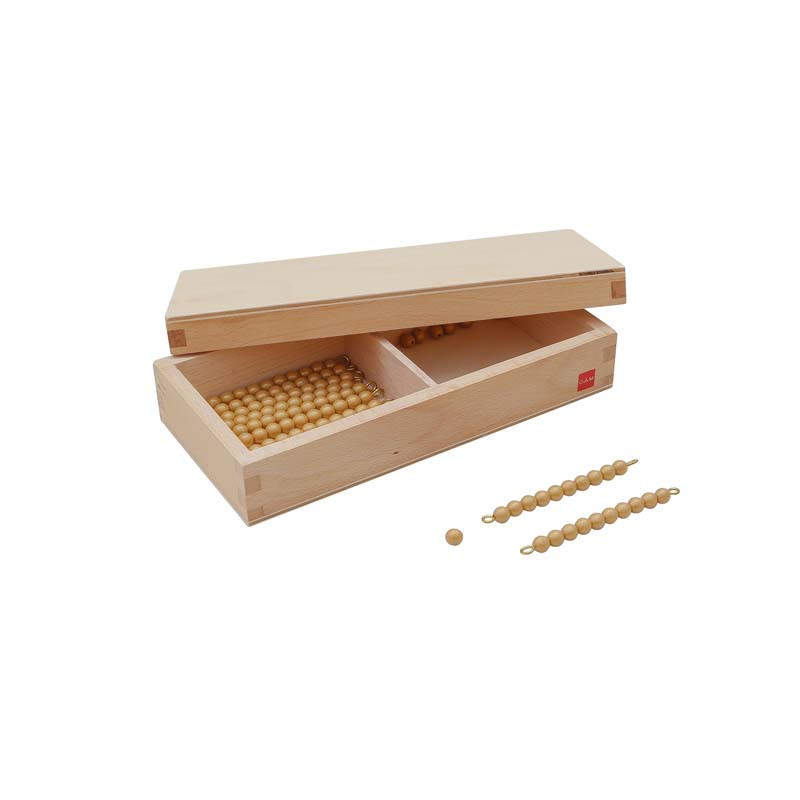 Scatola in legno, con due scompartimenti, contenente 9 bastoncini del 10 e 9 unità di perle oro, da utilizzare con le Tavole del Seguin 11-99.