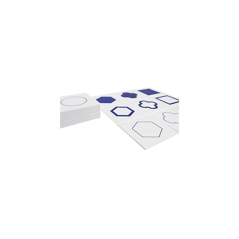 I Cartellini delle Figure Geometriche comprendono 3 serie di 35 cartellini corrispondenti alle figure contenute negli Incastri delle Figure Geometriche: una serie raffigura le forme geometriche con il bordo sottile, una con il bordo spesso e l'altra raffigura figure geometriche piene. (Schedario venduto separatamente)