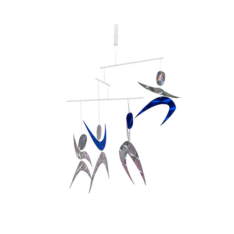 Un mobile per il focus visivo, con figure sospese realizzate in carta olografica e appese con filo sottile.
