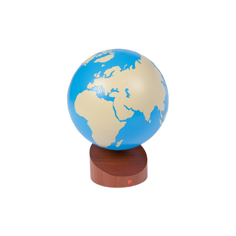 Con il Globo a Due Colori si introduce il concetto di continente. Il Globo ha una superficie interamente liscia; il colore beige rappresenta le terre emerse e l'azzurro l'acqua. La base in legno mantiene il globo a un angolo di 23°, lo stesso dell'asse terrestre in rapporto al sole.