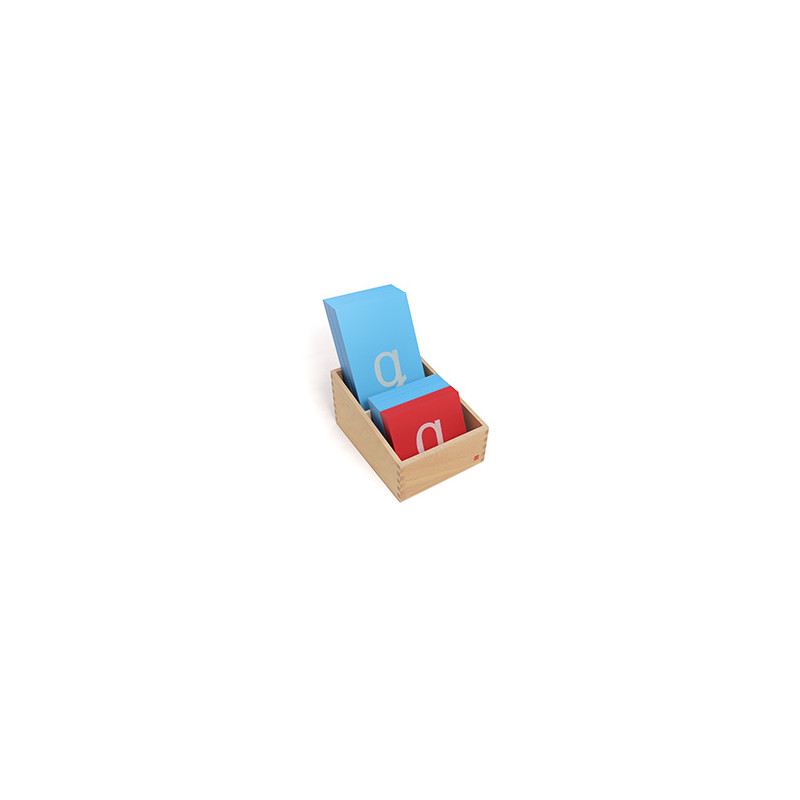 Le lettere smerigliate guidano la mano del bambino, che traccia la forma della lettera nello stile e nella direzione in cui sono scritte preparandolo così alla scrittura. Sono costituite da tavolette in legno di colore rosso per le vocali e blu per le consonanti. Il materiale include uno schedario in legno che contiene le lettere.