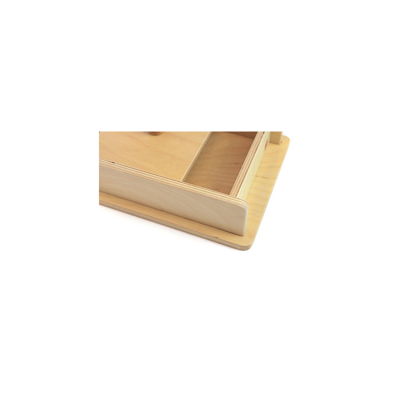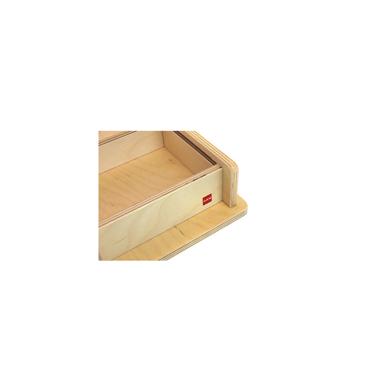 Scatola con due scompartimenti e un coperchio scorrevole. Il bambino inserisce diversi oggetti in uno scompartimento e scorre il coperchio per coprirli o scoprirli. (Oggetti non inclusi)