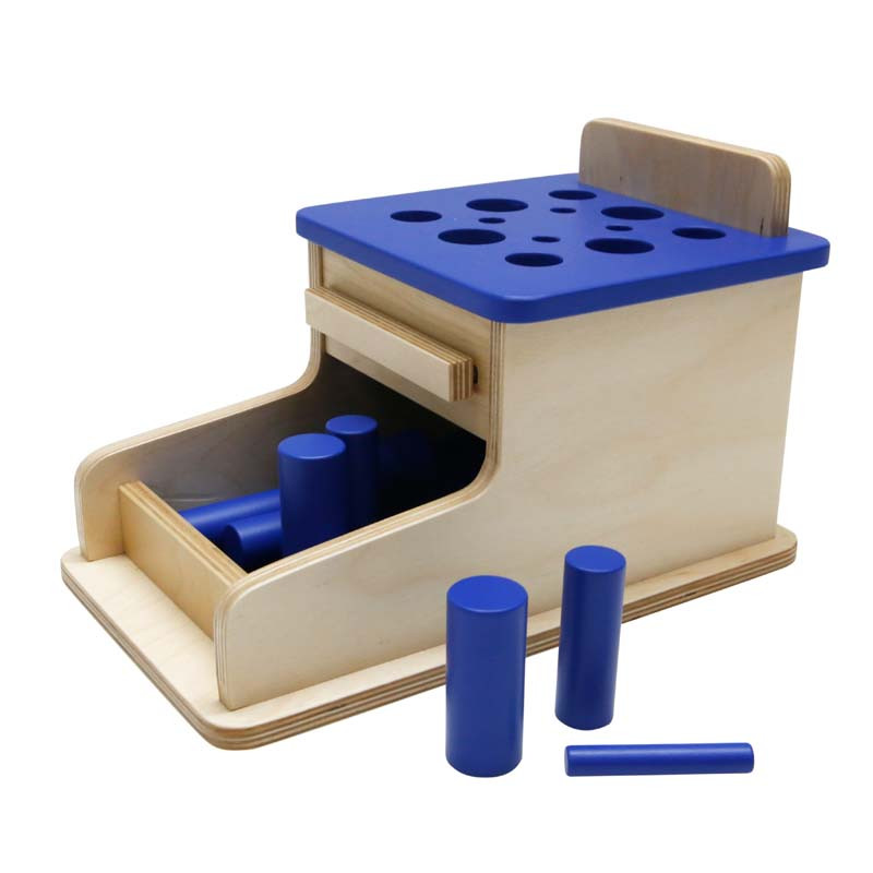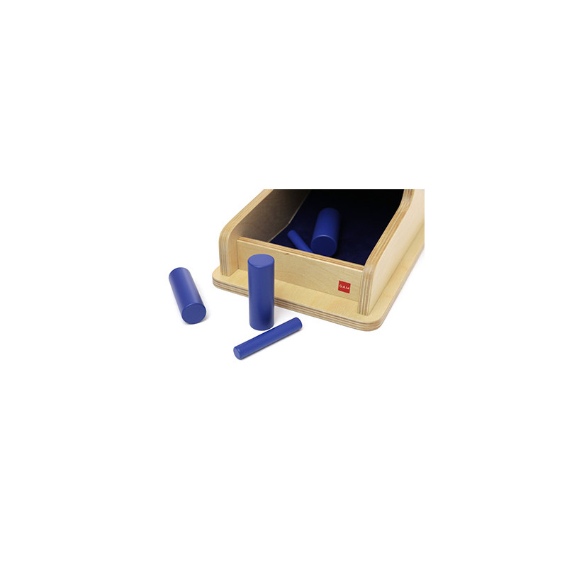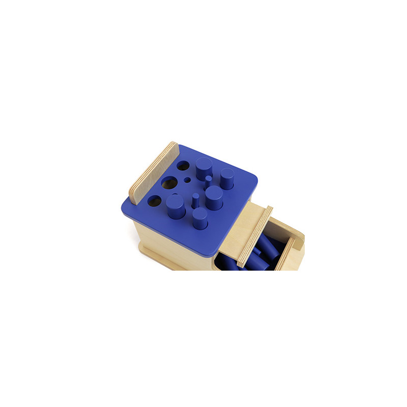 Questo materiale stimola la coordinazione occhio-mano. Il bambino può sperimentare una diversa modalità di introduzione ed estrazione di cilindretti di diverso diametro. Il materiale consiste di una scatola di legno naturale dotata nella parte superiore di dodici fori differenti, su cui infilare altrettanti cilindretti della stessa altezza ma di diverso diametro. Estraendo il cassettino, i cilindri scivolano fino al bordo esterno che ne blocca la fuoriuscita.