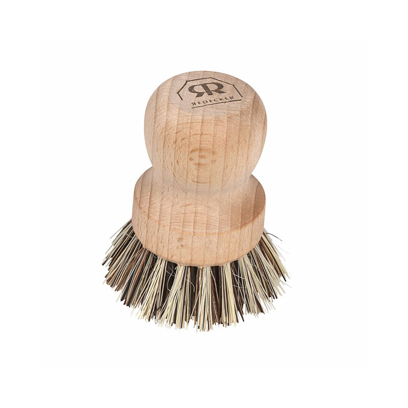 Una spazzola in legno di faggio non trattato con fibre per lavare e strofinare un tavolo. Diametro: Ø 6,5 cm.