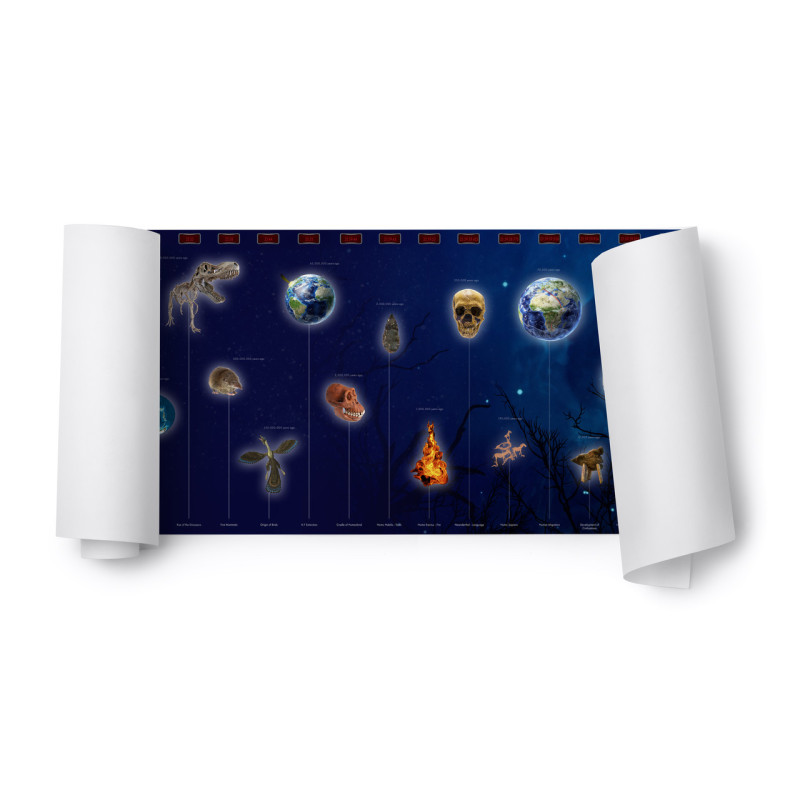 Striscia che consente ai bambini di posizionare tutte le altre strisce in prospettiva. L’unica linea temporale che mostra la Grande Storia e offre la possibilità ai bambini rendersi conto di cosa si intende per educazione cosmica. Esplora concetti dal Big Bang al Progetto Genoma Umano. Progettato e basato sul popolare Orologio delle Ere, questa striscia elenca tutti gli eventi principali e le grandi lezioni in un contesto lineare. Tuttavia, poiché si basa sull’Orologio delle Ere, a ogni evento è anche dato un luogo cronologico su un orologio di 24 ore. Così il bambino è in grado non solo di vedere le grandi civiltà antiche, ma può vedere in quale ordine sono venute e a che ora sono fiorite se si potesse ridurre l’intera storia del nostro cosmo in 24 ore.