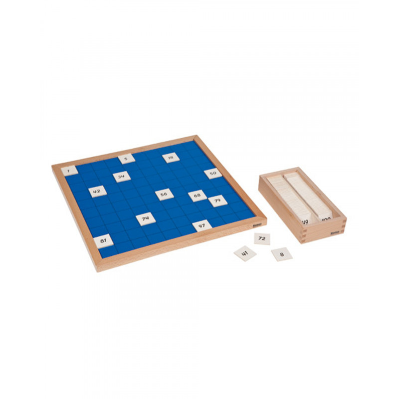Un materiale utilizzato per l'insegnamento della sequenza numerica da 1 a 100. Il materiale è costituito da una tavola di legno stampato con 100 caselle e una scatola con coperchio contenente tombolini in plastica stampati con i numeri 1-100.